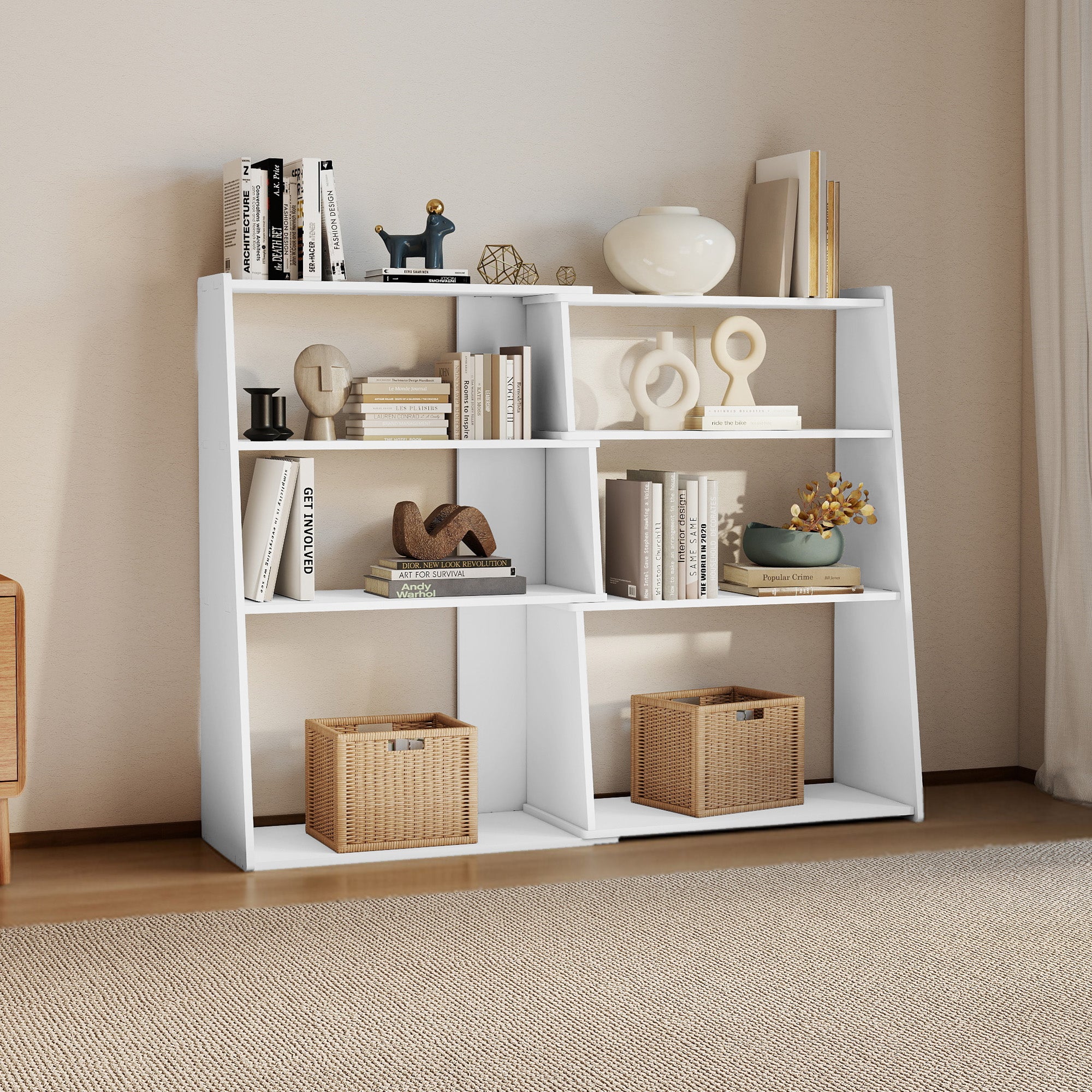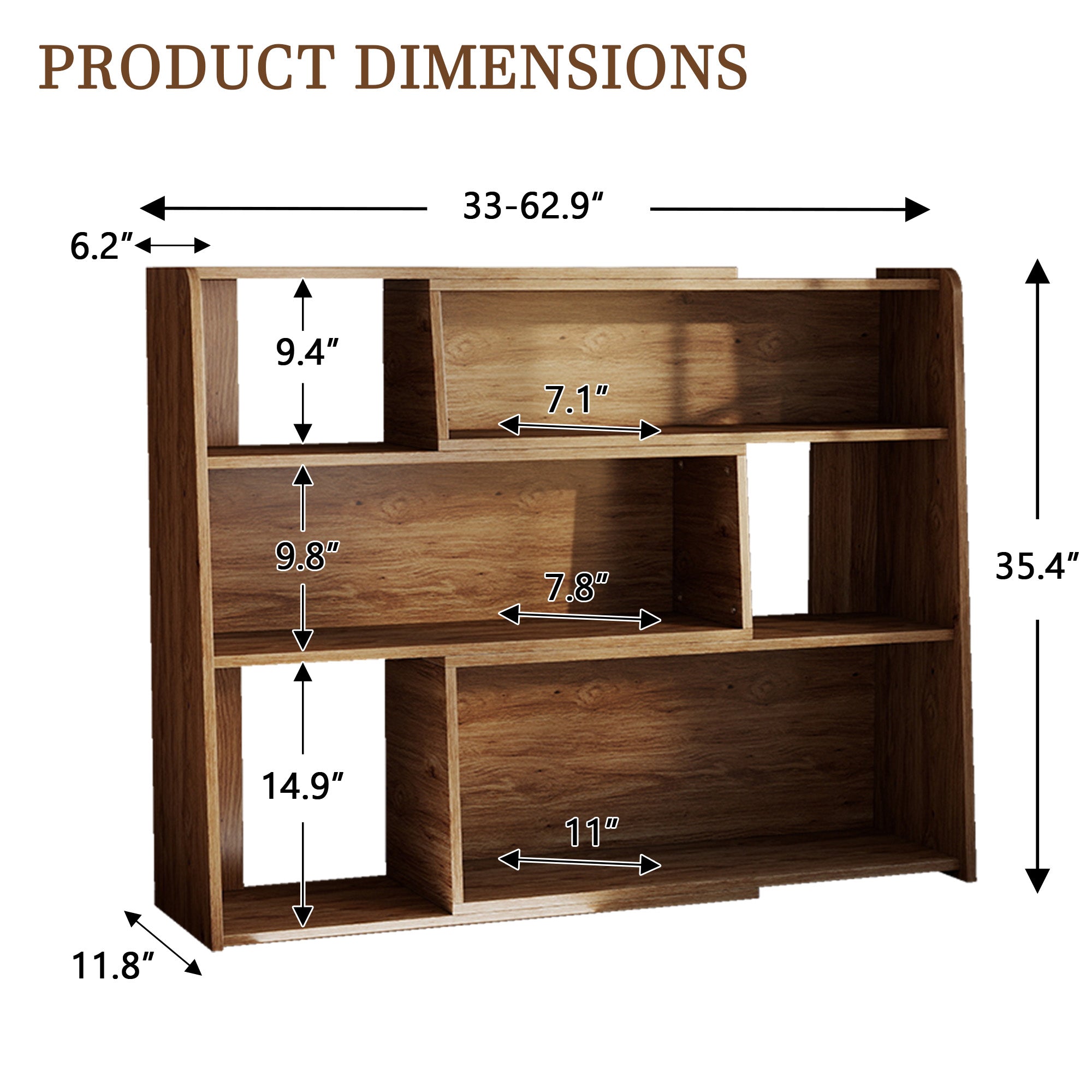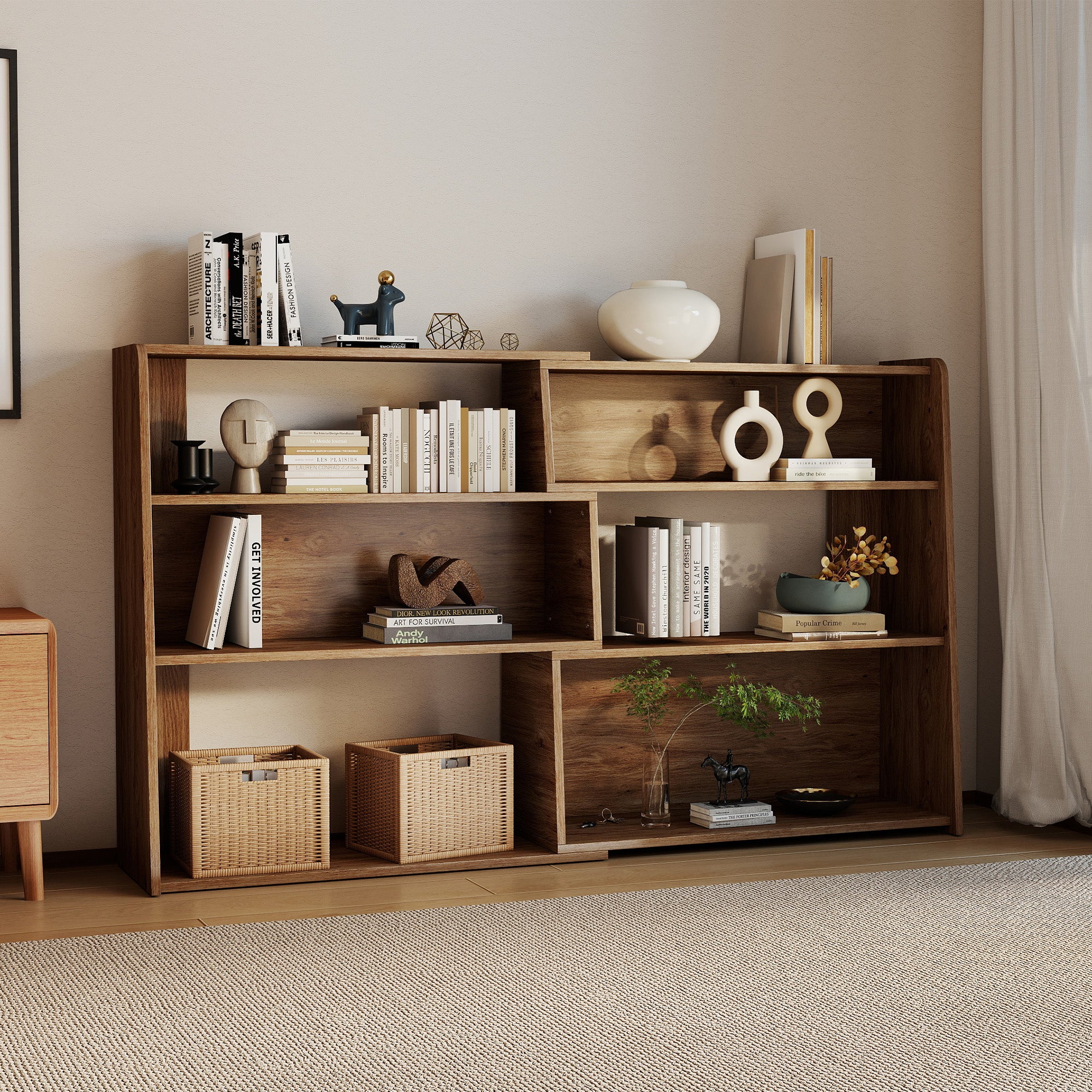 A flexible, modular design wooden bookshelf that can be adjusted in length and shape to fit any room layout.
